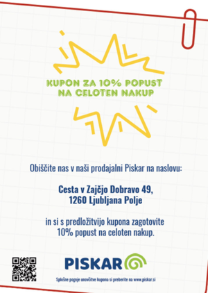 Kupon velja samo za zasebne nakupe oz. končne potrošnike. Uporaba pri nakupih na podjetje ali s.p. žal ni možna. Hvala za razumevanje!